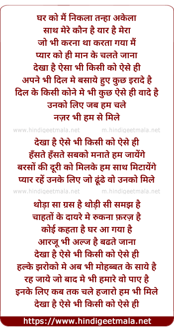 Lyrics of Dekha Hain Aise Bhi - घर को मैं निकला तन्हा अकेला