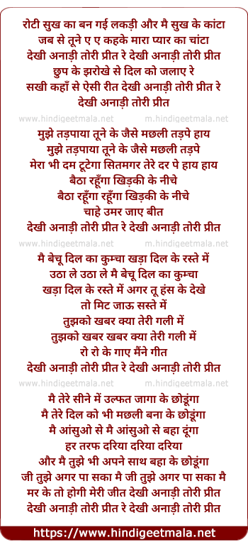 Lyrics of Dekhi Anadi Tori Preet Re, Chhup Ke Jharoke Se Dil Ko Jalaye - देखी अनाड़ी तोरी प्रीत रे, छुप के झरोखे से दिल को जलाए