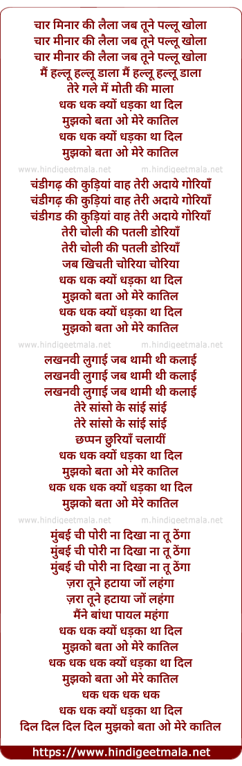 Lyrics of Dhak Dhak Kyo Dhadka Tha Dil - धक धक क्यों धड़का था दिल