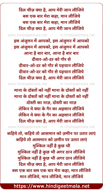 Lyrics of Dil Chiz Kya Hai, Aap Meri Jaan Lijiye - दिल चीज़ क्या है, आप मेरी जान लीजिये