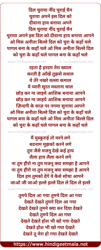 Lyrics of Dil Churaya Nind Churayi Chain Churaya - दिल चुराया नींद चुराई चैन चुराया