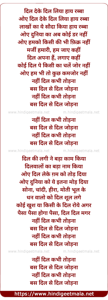 Lyrics of Dil Deke Dil Liyaa - दिल देके दिल लिया हाय रब्बा