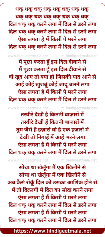 Lyrics of Dil Dhak Dhak Karne Laga, Main Dil Se Darne Laga - दिल धक् धक् करने लगा, मैं दिल से डरने लगे