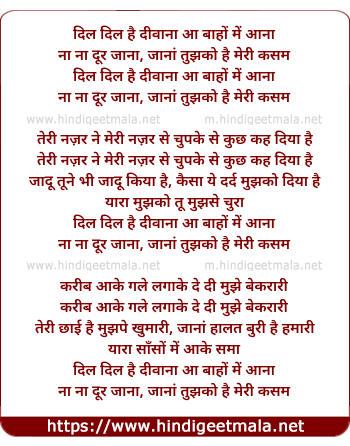 Lyrics of Dil Dil Hai Divana Aa Baho Me Aana - दिल दिल है दीवाना आ बाहों में आना