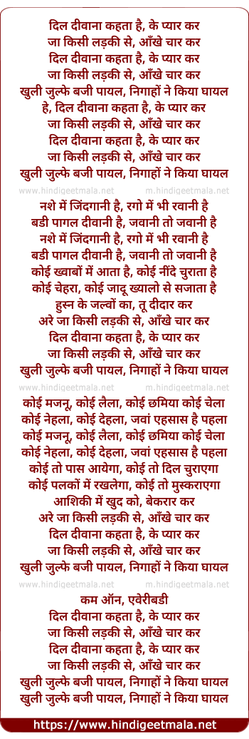 Lyrics of Dil Divana Kehta Hai Ke Pyar Kar - दिल दीवाना कहता है के प्यार कर