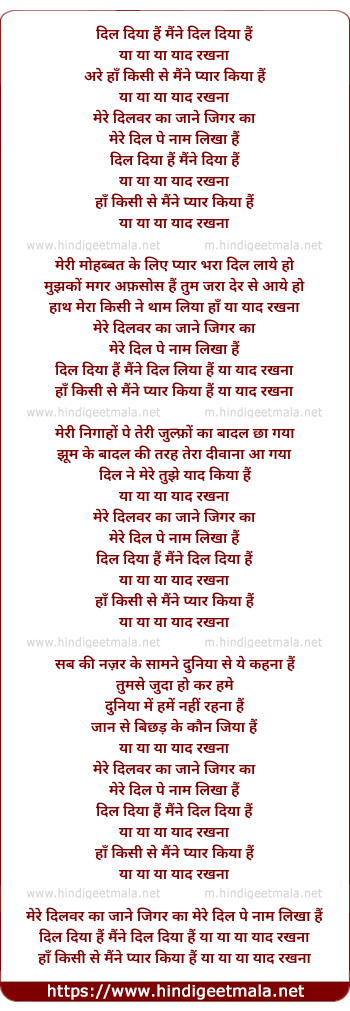 Lyrics of Dil Diya Hai Maine Yaad Rakhana - दिल दिया हैं मैंने याद रखना