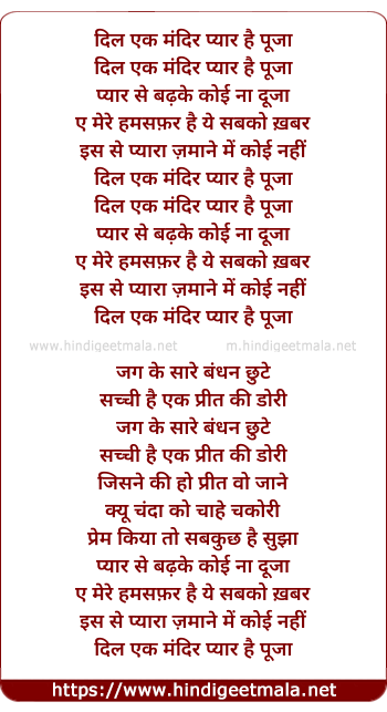 Lyrics of Dil Ek Mandir Pyar Hai Pooja - दिल एक मंदिर प्यार है पूजा