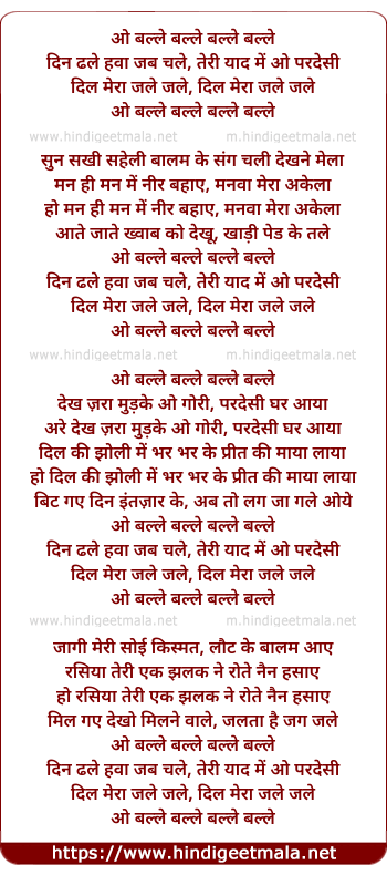 Lyrics of O Balle Balle, Din Jale Hawa Jab Chale - ओ बल्ले बल्ले, दिन जले हवा जब चले