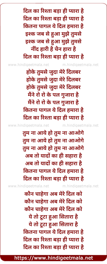 Lyrics of Dil Ka Rishta Bada Hi Pyara Hai (Sad) - दिल का रिश्ता बड़ा ही प्यारा है