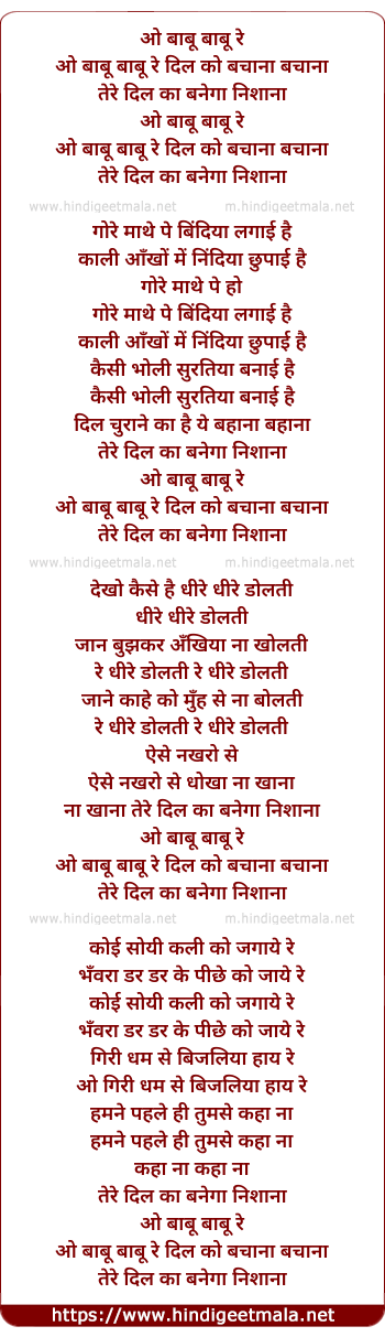 Lyrics of O Babu Babu Re Dil Ko Bachana - ओ बाबू बाबू रे दिल को बचाना
