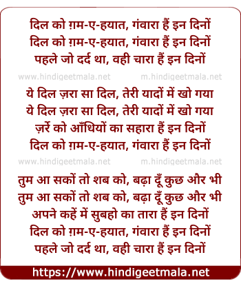 Lyrics of Dil Ko Ghame Hayat Gawara Hai In Dino - दिल को ग़म-ए-हयात, गंवारा हैं इन दिनों