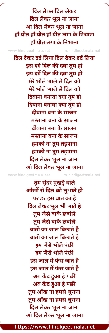 Lyrics of Dil Le Kar Bhool Na Jana - दिल लेकर दिल लेकर