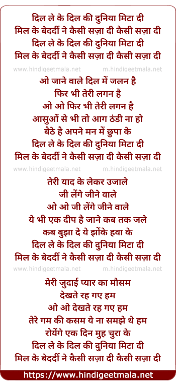 Lyrics of Dil Le Ke Dil Ki Duniya Mita Di - दिल ले के दिल की दुनिया मिटा दी