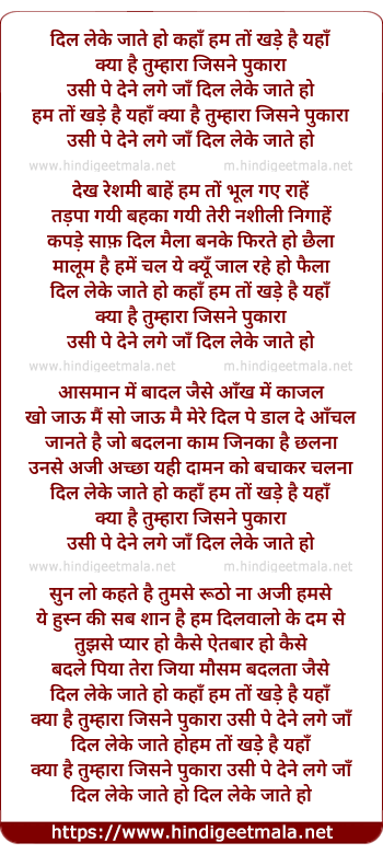 Lyrics of Dil Le Ke Jate Ho Kaha Ham To Khade Hai Yaha - दिल ले के जाते हो कहाँ हम तो खड़े है यहाँ