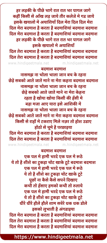 Lyrics of Dil Mera Badmaash Karta Hai Babmaashiya - दिल मेरा बदमाश करता है बदमाशियां