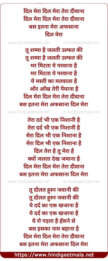 Lyrics of Dil Mera Tera Diwana - दिल मेरा दिल मेरा तेरा दीवाना