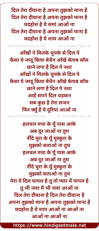 Lyrics of Dil Tera Diwana Hai Apna Tujhko Mana Hai - दिल तेरा दीवाना है अपना तुझको माना है