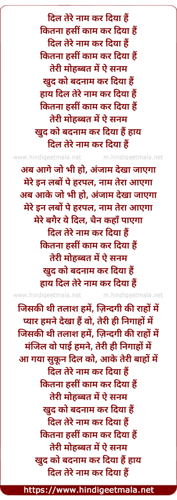 Lyrics of Dil Tere Naam - दिल तेरे नाम