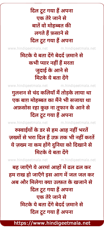 Lyrics of Dil Toot Gaya Hai Apna - दिल टूट गया हैं अपना