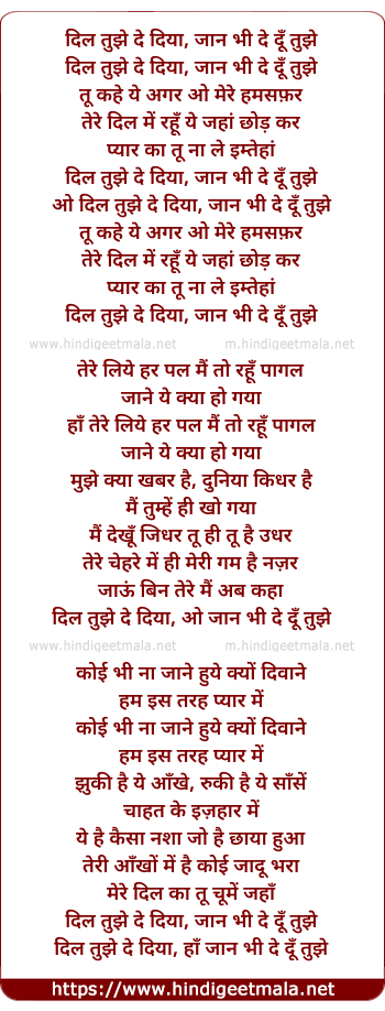 Lyrics of Dil Tujhe De Diya, Jaan Bhi De Du Tujhe - दिल तुझे दे दिया, जान भी दे दूँ तुझे