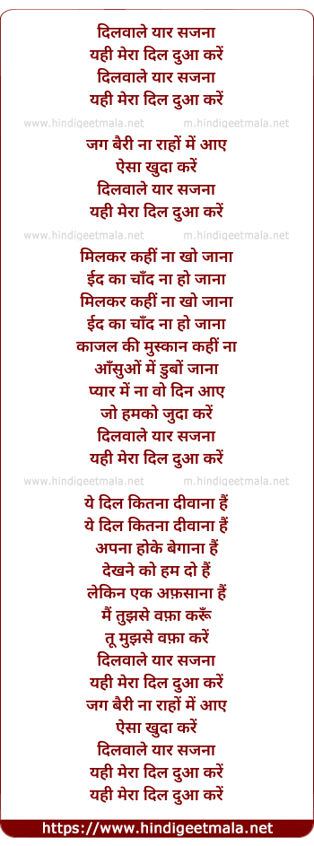 Lyrics of Dil Wale Yaar Sajna - दिलवाले यार सजना