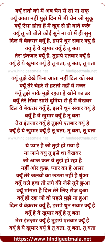 Lyrics of Dil Ye Bekarar Kyun Hai - दिल ये बेक़रार क्यूँ है