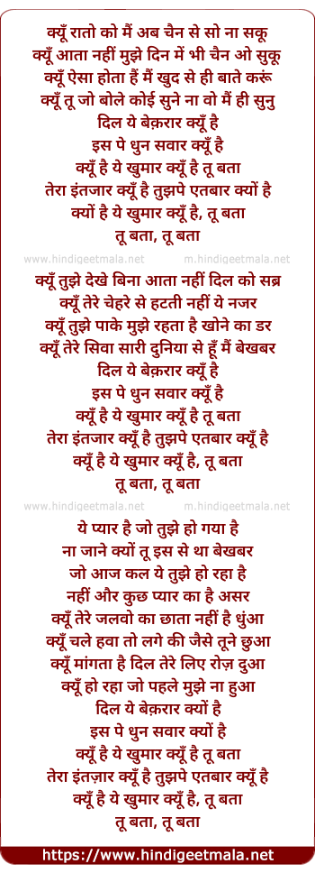 Lyrics of Dil Ye Bekarar Kyun Hai (Reprise) - क्यूँ रातो को मैं अब चैन से सो ना सकू