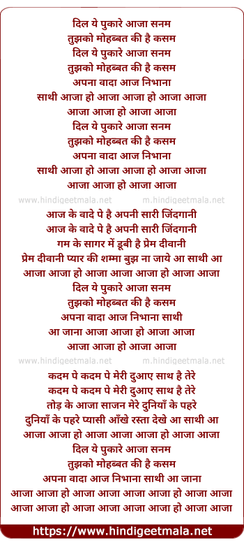 Lyrics of Dil Ye Pukare Aaja Sanam Tujhko Mohabbat Ki Hai Kasam - दिल ये पुकारे आजा सनम तुझको मोहब्बत की है कसम