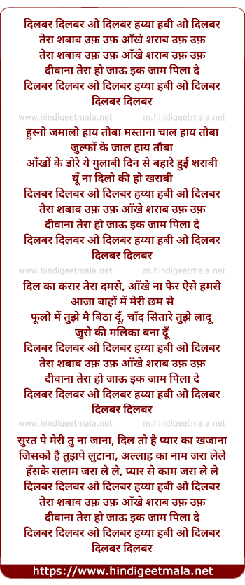 Lyrics of Dilbar Dilbar Ho Dilbar - दिलबर दिलबर ओ दिलबर