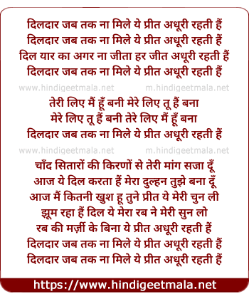 Lyrics of Dildar Jab Tak Na Mile Ye Preet Adhuri Rehti Hai - दिलदार जब तक ना मिले ये प्रीत अधूरी रहती हैं