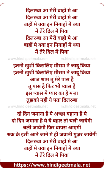 Lyrics of Dilruba Aa Meri Baaho Me - दिलरुबा आ मेरी बाहों में आ
