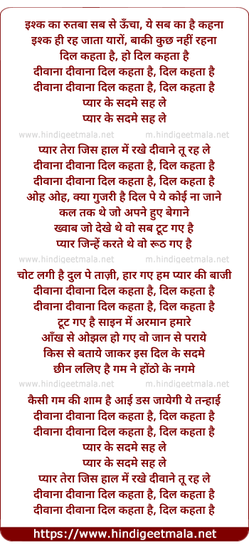 Lyrics of Divana Divana Dil Kehta Hai - दीवाना दीवाना दिल कहता है