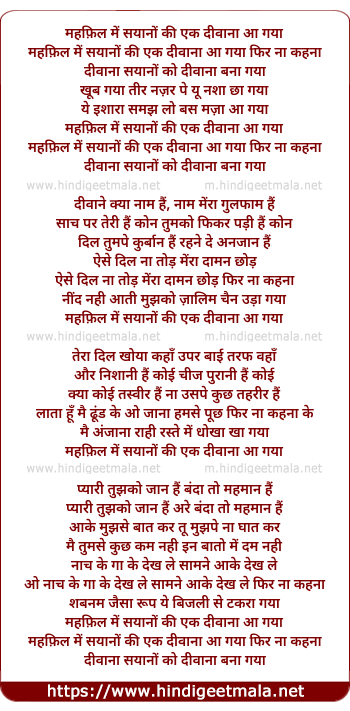 Lyrics of Diwana Sayano Ko Diwana Bana Gaya - दीवाना सयानों को दीवाना बना गया