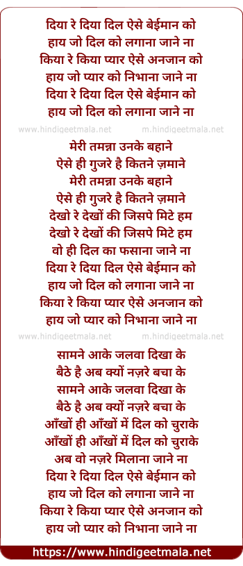 Lyrics of Diya Dil Aise Beimaan Ko - दिया दिल ऐसे बेईमान को