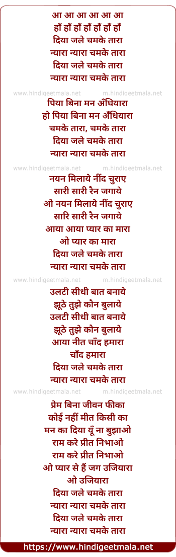 Poetic Translation - Lyrics of Diya Jale Chamke Taara - दिया जले चमके तारा