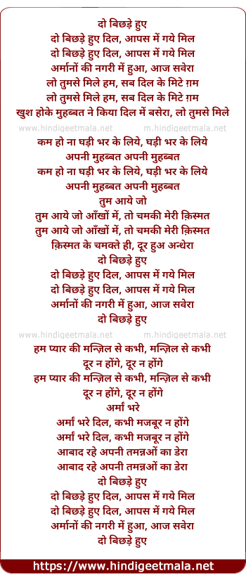 Lyrics of Do Bichhde Hue Dil, Aapas Me Gaye Mil - दो बिछड़े हुए दिल, आपस में गये मिल