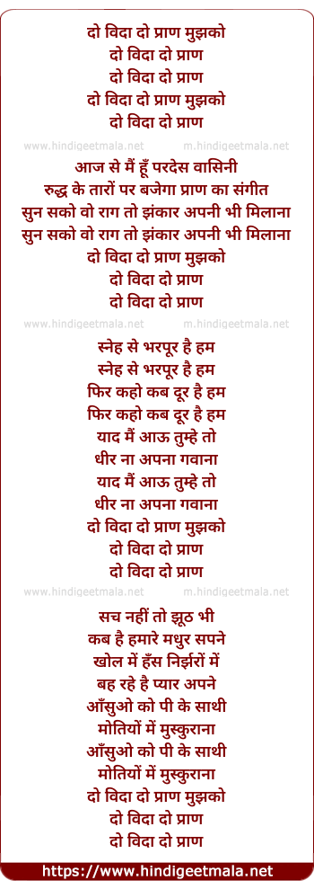 Lyrics of Do Wida Do Pran Mujhko - दो विदा दो प्राण मुझको