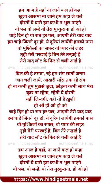Lyrics of Dosti (Remix) - हम आज है यहाँ ना जाने कल हो कहा