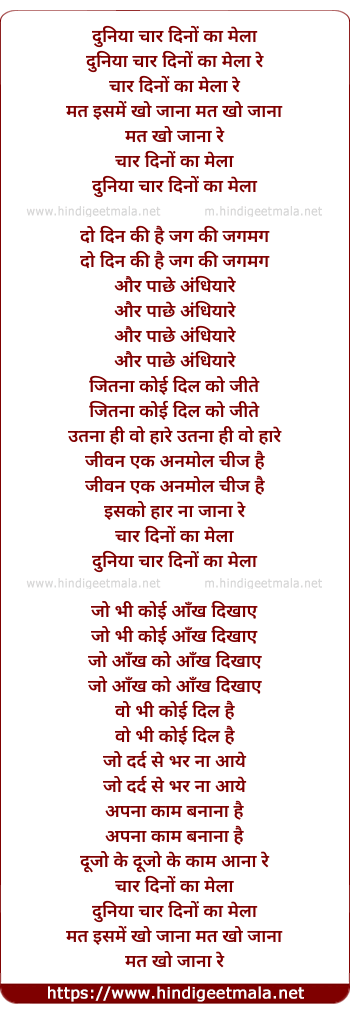 Lyrics of Duniya Char Dino Ka Mela - दुनिया चार दिनों का मेला