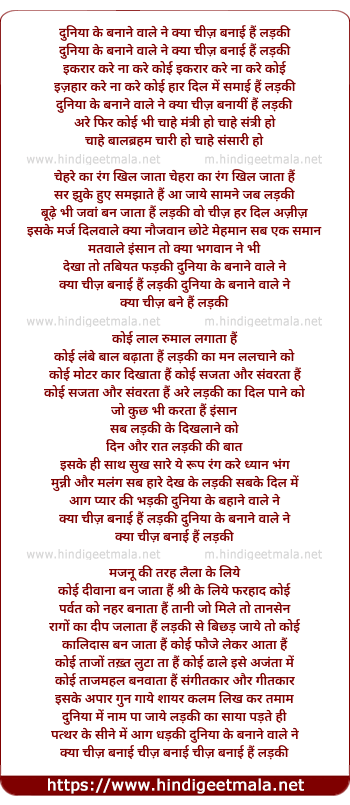 Lyrics of Duniya Ke Banane Wale Ne - दुनिया के बनाने वाले ने क्या चीज़ बनाई हैं लड़की