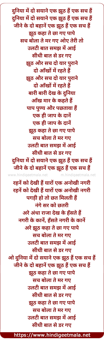 duniya me do sayane ek jhuth hai ek sach hai