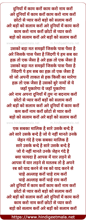 Lyrics of Duniya Me Kaam Karo, Kaam Karo Naam Karo - दुनियाँ में काम करों, काम करो नाम करों