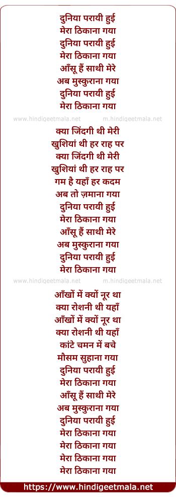 Lyrics of Duniya Parayi Hui - दुनिया परायी हुई