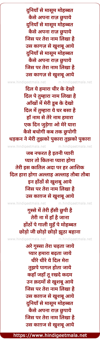 Lyrics of Duniya Se Masum Mohabbat Kaise Apna - दुनियाँ से मासूम मोहब्बत कैसे अपना