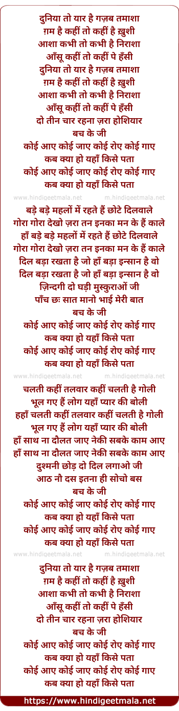 Lyrics of Duniya To Yaar Hai Gazab Tamaasha - दुनिया तो यार है गज़ब तमाशा