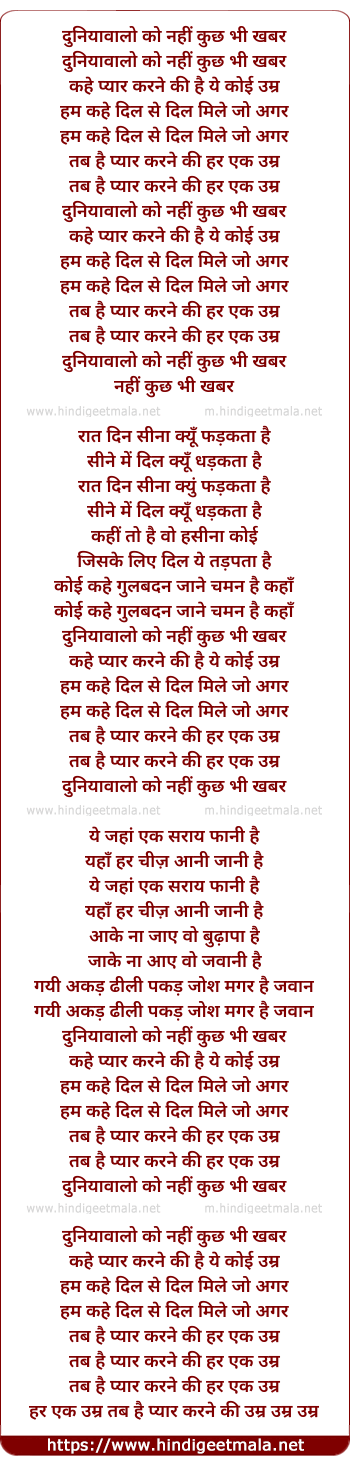 Lyrics of Duniyawaalo Ko Nahee Kuchh Bhee Khabar - दुनियावालो को नहीं कुछ भी खबर