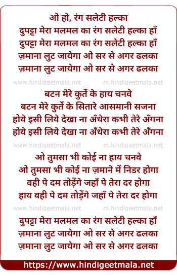 Lyrics of Dupatta Mera Malmal Ka Rang Saleti Halka - दुपट्टा मेरा मलमल का रंग सलेटी हल्का