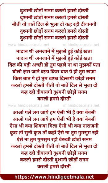 Lyrics of Dushmani Chhodo Sanam Karlo Humse Dosti - दुश्मनी छोड़ों सनम करलो हमसे दोस्ती