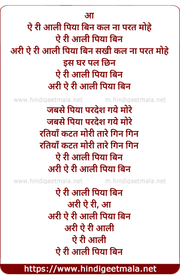 Lyrics of Ae Ri Aali Piya Bin Kal Na Parat Mohe - ऐ री आली पिया बिन कल ना परत मोहे