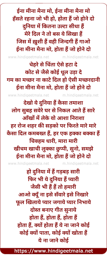 Lyrics of Eena Meena Mynaa Mo, Hanste Rehna Jo Bhi Ho - ईना मीना मैना मो, हँसते रहना जो भी हो